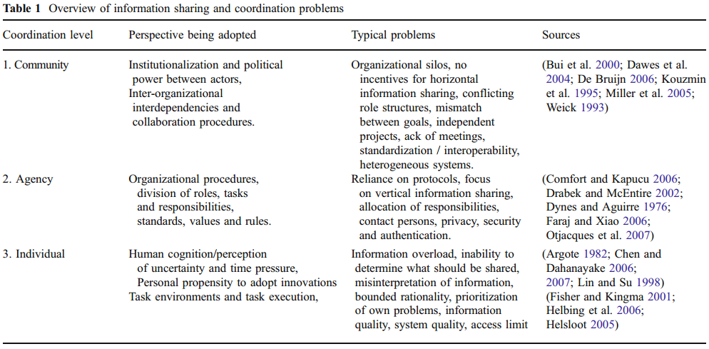Bharosa and Janssen (2010) provide a great overview of information sharing issues based on different levels of the problem. At the community level, they show that organizational silos are present and there is a lack of incentive for inter-organizational information sharing. At the agency or organization level, there is a reliance on protocols and information sharing up and down the operational hierarchy. At the individual level, there are problems with information overload, not knowing what to share, ability to process information and overall information quality.