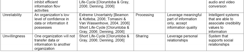 Contrastingly, Day, Junglas and Silva (2009) identify more mechanistic problems with information sharing and narrow down the issues to eight key impediments surrounding information collection, processing and sharing. Many people have experienced one or more of these impediments in their operations as they attempt to gain situation awareness and make good decisions. As you develop your information management strategy for your organization, consider how each of your systems hinders or improves these impediments.
